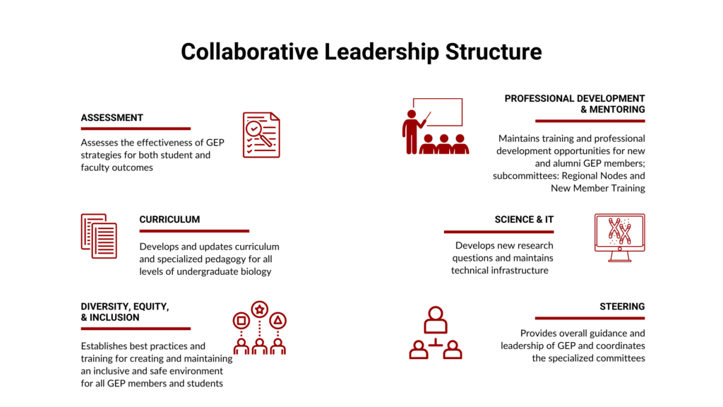 The leadership structure of GEP 2.0 is distributed across five specialized committees—Assessment, Curriculum, Diversity, Equity, & Inclusion (DEI), Professional Development & Mentoring (PDM), and Science & IT—each of which addresses specific priorities and are overseen by the Steering Committee.