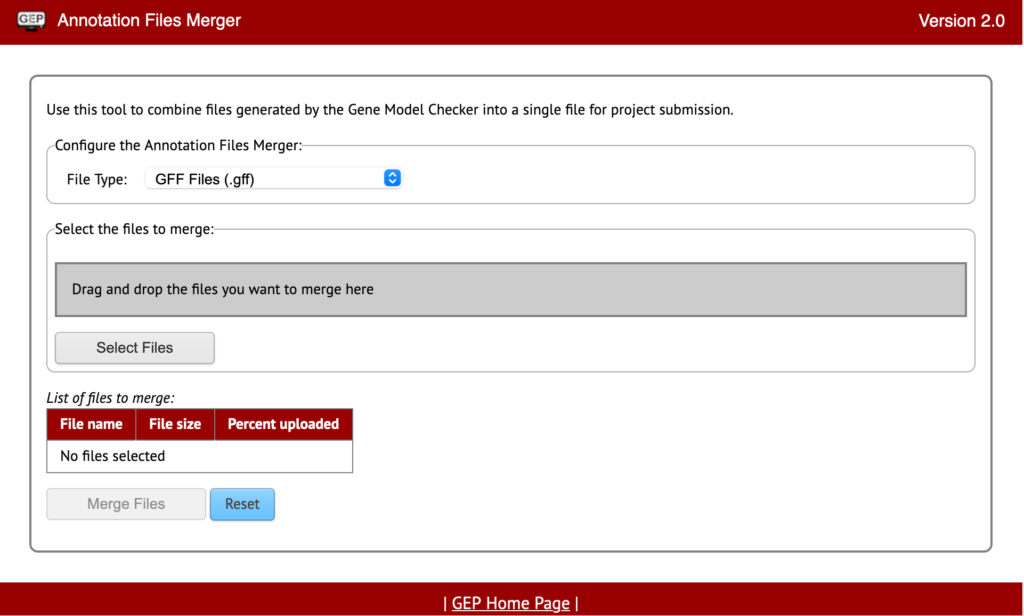 The Annotation Files Merger allows for the merging of multiple files gathered during the annotation process. This is important because it allows consistency in data collection and a quick method to review everything from a top-down glance. The supported file types for the annotation files merger are: GFF (Generic Feature Format), FASTA (FAST-ALL), PEP (Peptide File Format), and VCF (Variant Call Format).
