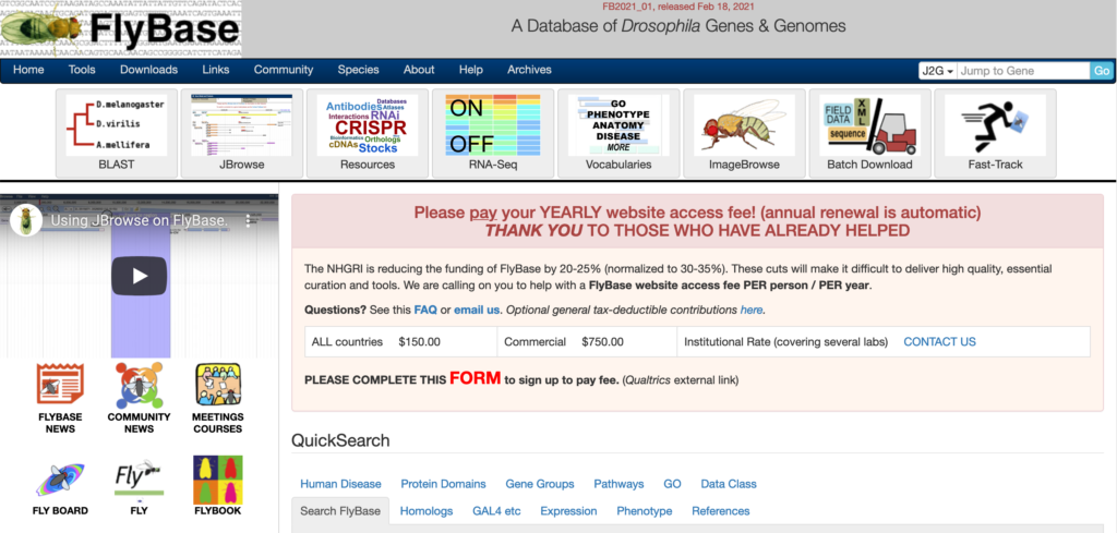 FlyBase is a bioinformatic database for all things Drosophila. This website can be a great place to study the who, what, where, when, and why behind a particular gene within D. melanogaster. You can best use FlyBase by searching for individual genes to uncover detailed reports that summarize genomic location, functionality, orthological pairing, and much, much more.