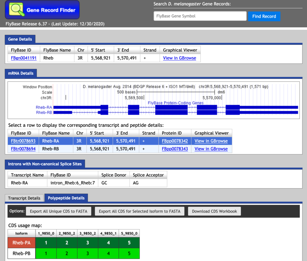 The Gene Record Finder can be used to break down the complex information from FlyBase into a quick and easy-to-read form. More importantly, the Gene Record Finder can provide transcription details, polypeptide details, and isoforms for the gene you are examining.