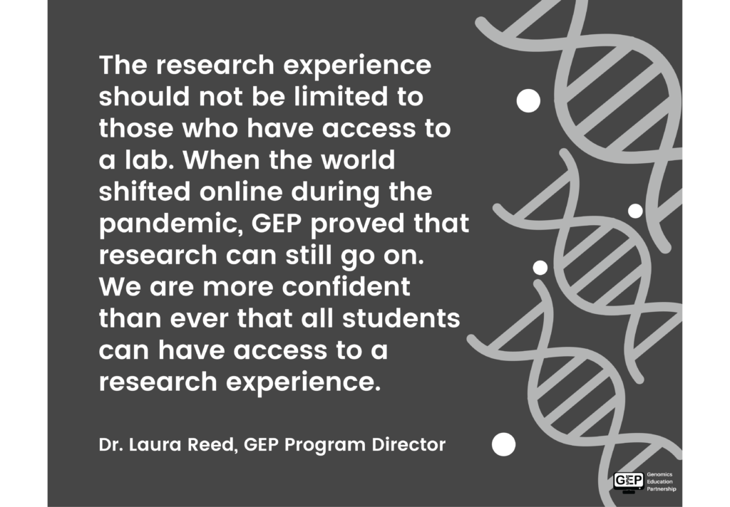 GEP’s video entry, “Democratizing Genomics Research Experiences in a Pandemic,” had over 1,100 views! We greatly appreciate everyone that liked and shared our video to help us spread the word about our incredible partnership.