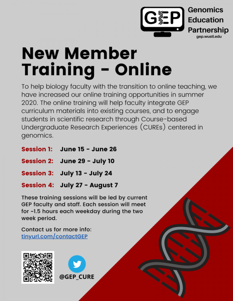 To help biology faculty with the transition to online teaching, we have increased our online training opportunities in summer 2020. The online training will help faculty integrate GEP curriculum materials into existing courses, and to engage students in scientific research through Course-based Undergraduate Research Experiences (CUREs) centered in genomics.