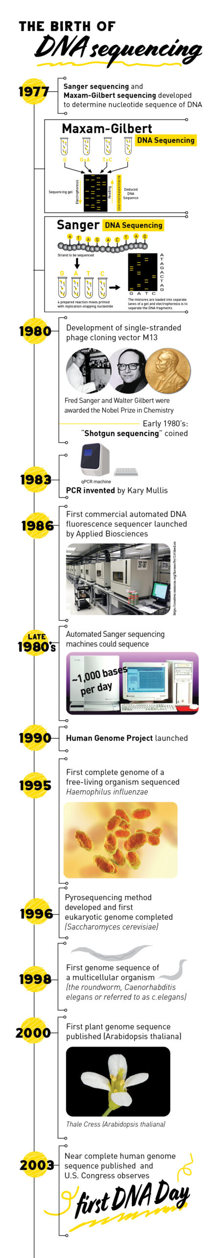 Being able to detect and analyze changes in an organism’s DNA is important for answering questions about health, disease, and other biological phenomena. However, we have not always been able to easily identify the precise order of DNA bases, called a DNA sequence. In fact, rapid sequencing technology did not come about until almost twenty years after James Watson and Francis Crick, along with Rosalind Franklin and Maurice Wilkins, proposed that DNA exists as a three-dimensional, double-helix structure.
